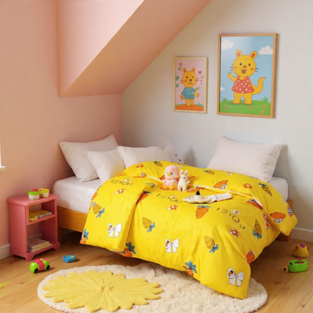 Refresh your room with a cheerful yellow duvet cover featuring a playful carrot print. Made for everyday comfort and easy care—perfect for kids’ rooms, teens, or student dorms.
